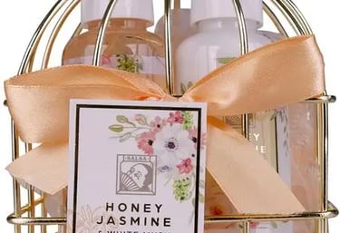 Accentra - Set de douche cadeau pour femmes HONEY JASMINE dans corbeille métallique - Kit soins 3 pcs avec gel douche, lotion et savon - Cadeaux bien-être pour l'anniversaire, Saint Valentin